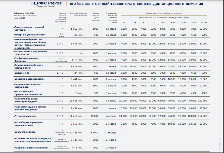 Перечень видео-тренингов и цена за одного студента указаны во вложении. Стоимость обучения для Вас - 500 рублей (ИТОГО ЗА ВСЕ КУРСЫ!), которая будет вычтена из квартальной премии. Всю остальную часть полностью покроет Холдинг, независимо от количества курсов, которые Вы пройдёте.