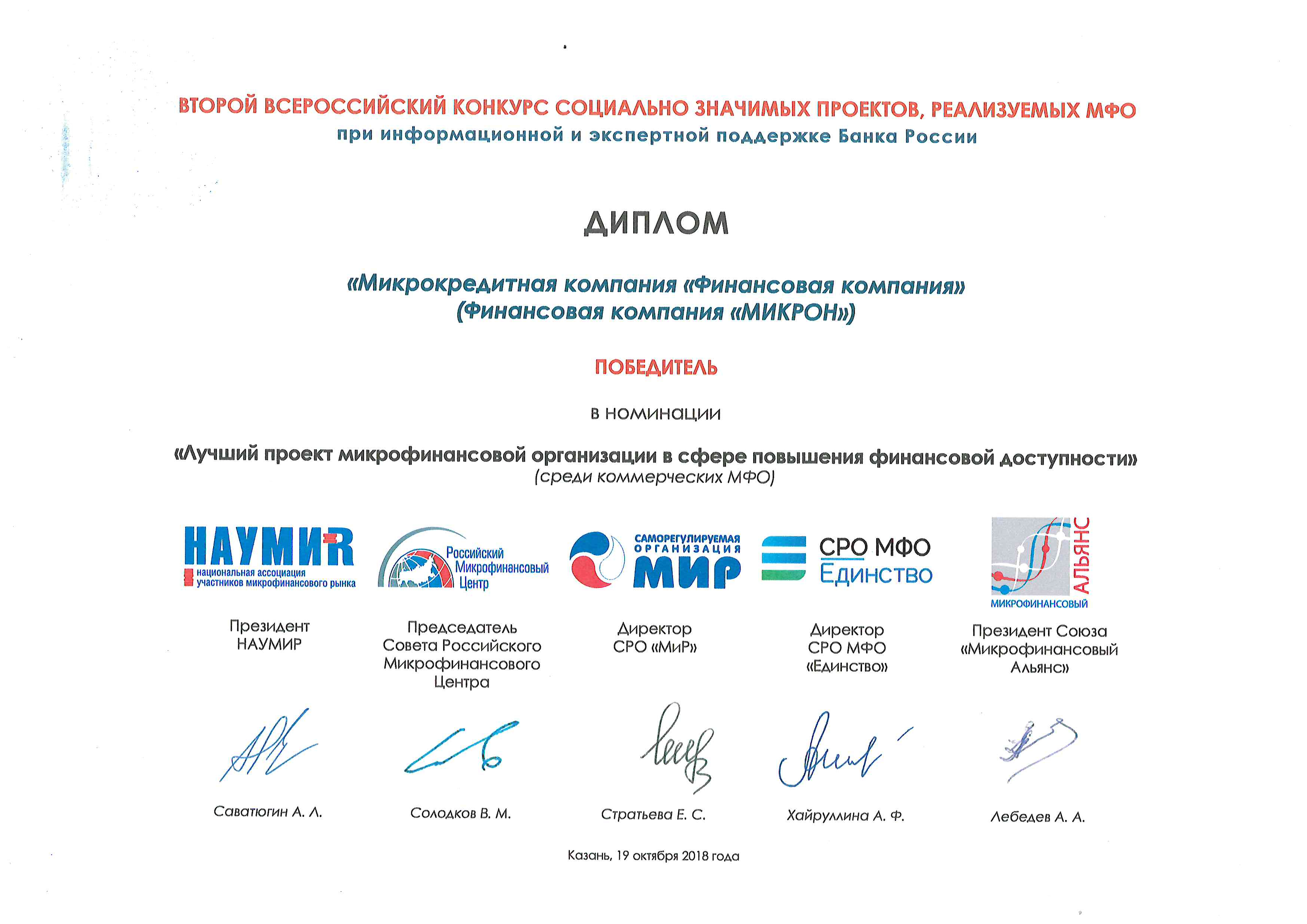 10 октября 2018 года в Москве были объявлены победители Второго Всероссийского конкурса социально значимых проектов, реализуемых микрофинансовыми организациями (МФО).